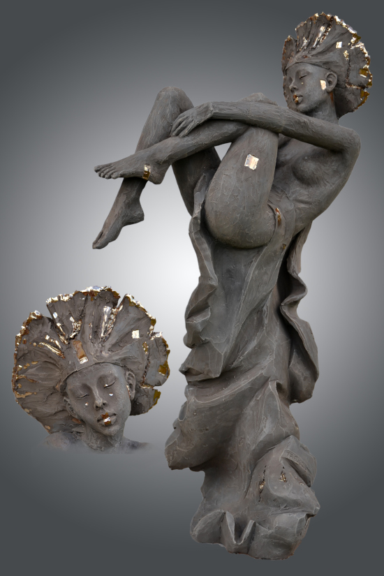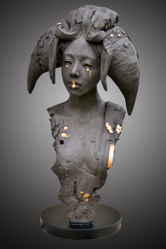 Des bustes de grès noir chamotté, mats, réhaussés de touches cuivrées ou dorées, mais aussi des corps plus ou moins complets… Toujours beaucoup de présence pour ces personnages féminins dans lesquelles vous retrouverez les codes de cet artiste à la personnalité artistique affirmé.