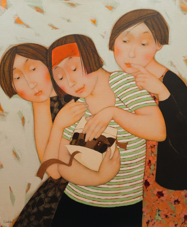 Si les femmes restent son thème de prédilection, quelques hommes trouvent désormais leur place dans son univers. Des petites bouilles d’enfants sages aux yeux brillants de malice ponctuent son univers tendre et attachant. Ses œuvres mettent en lumière des moments d’intimité, des scènes de la vie quotidienne, de bonheur simples que l’on ne doit pas oublier de savourer…