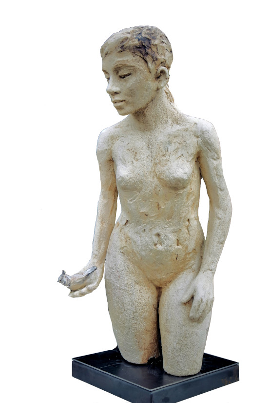 Fillette à la mésange (57x27x40 cm) – Grès, engobe porcelaine et oxydes – NOUVEAUTE